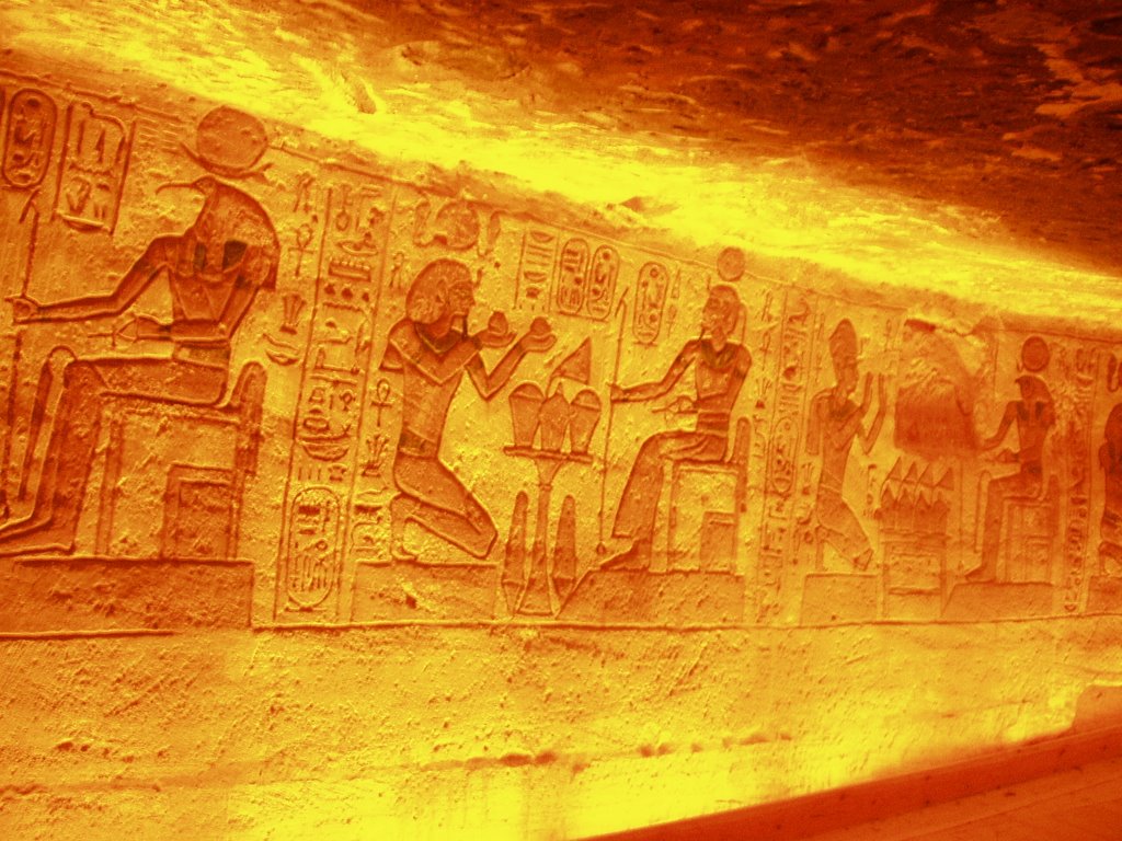Inside the temple of Rameses huge statues have been carved out of the rock. At the far end Rameses is depicted with three deities. These were illuminated only twice a year (October 22 and February 22) when a shaft of light from the rising sun penetrated the passage for a few minutes. Light would shine into the inner sanctuary and light up three statues seated on a bench, including one of the pharaoh. It’s been hypothesized that these dates may celebrate his coronation and birth.