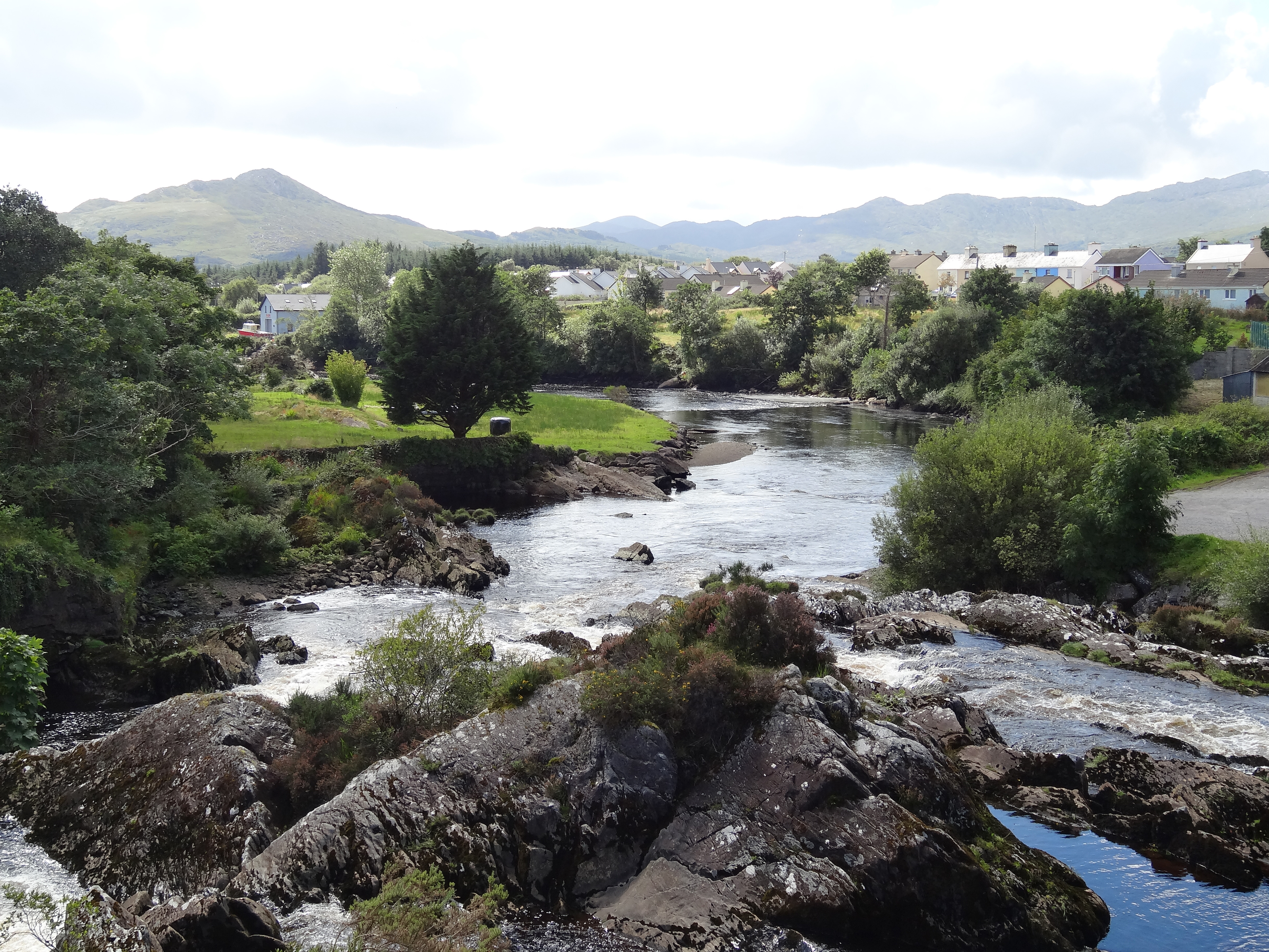 was for lunch , after crossing Waterville at a seaside bar and restaurant. This restaurant, though a small one, had wonderful views of sea. We had a plate of seafood salad and a seafood chowder at this restaurant for our lunch along with cold drinks.Our onward journey resumed soon after this stop. Late at around 3:30 pm we stopped at a cross road , where we could see the Beautiful ‘Gap of Dunloe’ on our left side and ‘Molls gap’ on our right. I had some homemade ice cream from a cafe there and after taking pics we went on to our onward journey to our last stop, where we could see the beauty of the ‘Molls gap’ more clearly and at a nearer distance. Next stop was at a small town called Sneem where there was a small water cascade with a good view. More photographs taken ….
