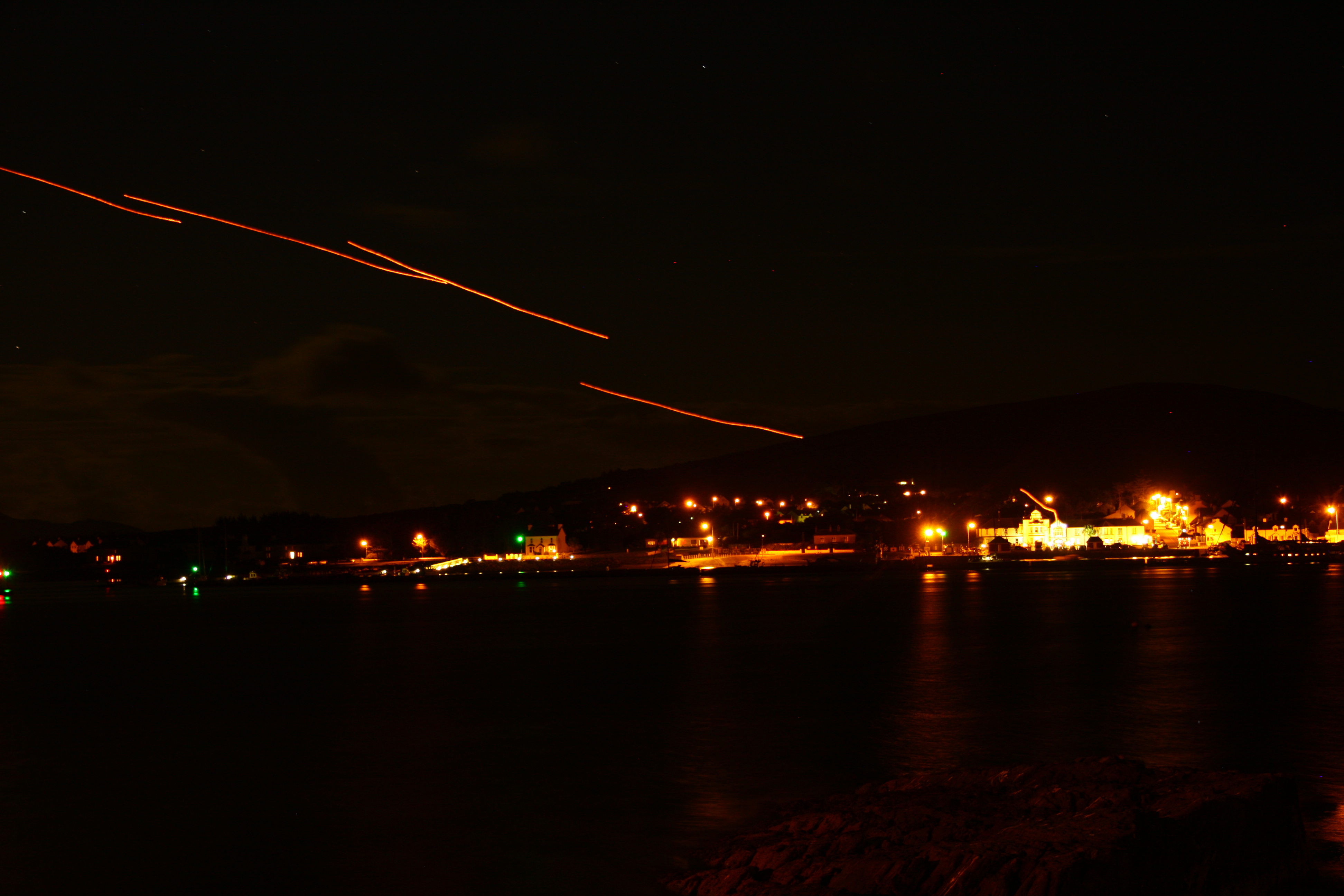 Dinner was served soon and it consisted of Deep Fried Squids, a pint of Guinness , a Glass of coke, A dish of Monkfish ‘Point Special’ served on potato with garlic, olive oil and chillies and A dish of Hake ‘Roman Style’ Served with sauce chips and salad. The owner realised that it was getting too cold outside and hence found out a place for us inside and we were really grateful for it. So after our sumptuous dinner we went back again to the Renard Point as Amit wanted to take night shots. While taking pics we saw a most amazing thing… people were releasing ‘Fire Lanterns’ from Valentia Island. These lanterns were looking so beautiful when released into the dark sky that we were mesmerized. Tried taking some pics of them, but were not successful as they didn’t come out as good as seen by naked eyes. Some beautiful things are better seen by naked eye as all moments cannot be captured in camera. It was around 10:30pm and really dark when I started hurrying Amit to get back to the hotel. The eerie darkness around me, the vast empty fields and the sea beyond started scaring me as I realised we had to walk all the way back to hotel in this darkness.