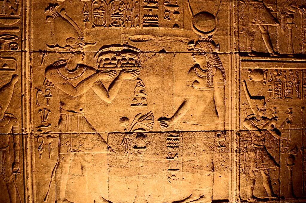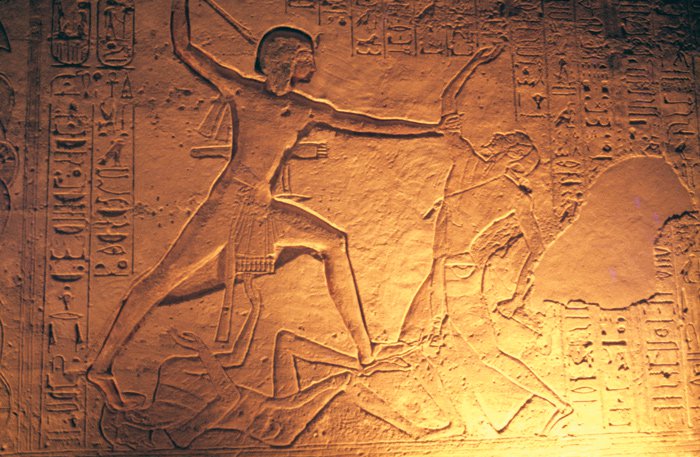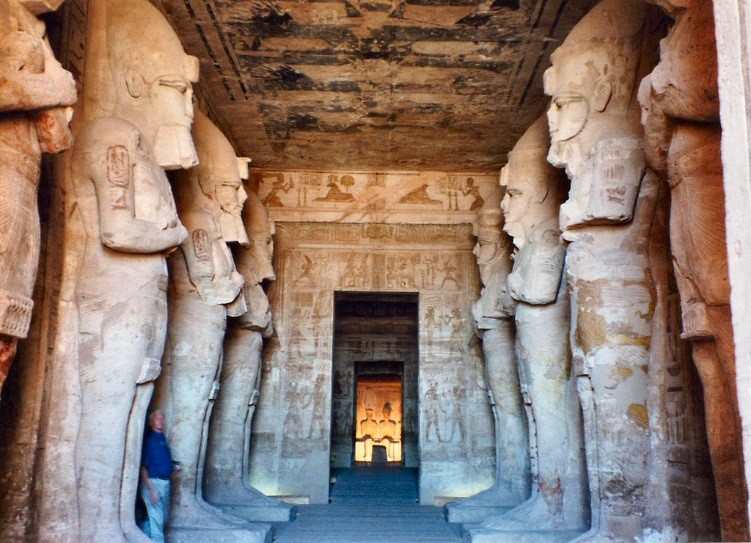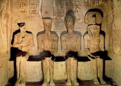 Inside the temple of Rameses huge statues have been carved out of the rock. At the far end Rameses is depicted with three deities. These were illuminated only twice a year (October 22 and February 22) when a shaft of light from the rising sun penetrated the passage for a few minutes. Light would shine into the inner sanctuary and light up three statues seated on a bench, including one of the pharaoh. It’s been hypothesized that these dates may celebrate his coronation and birth.