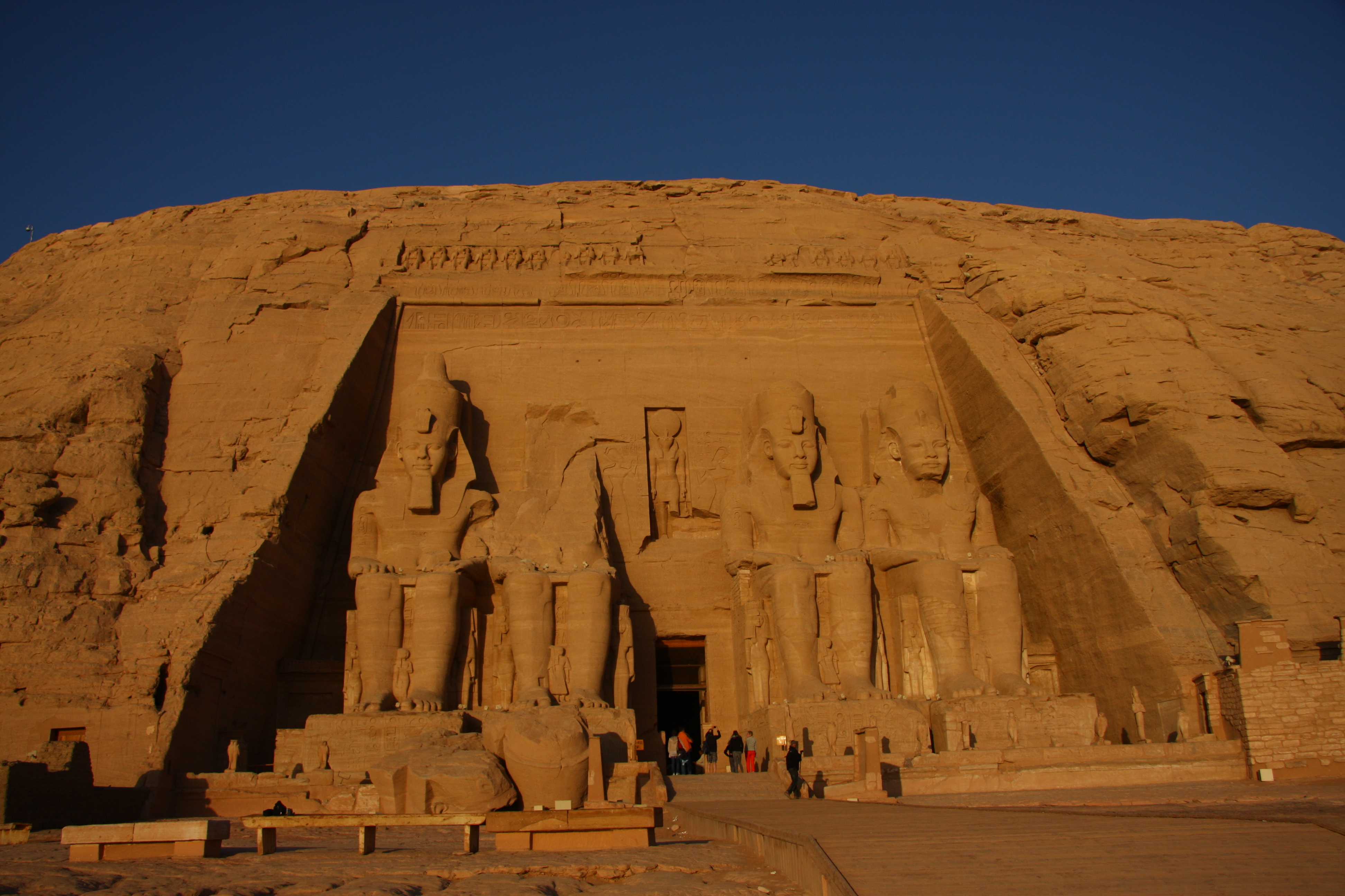 The larger of the two temples contains four colossal statues of a seated Ramesses II at its entrance, each about 69 feet (21 meters) tall.